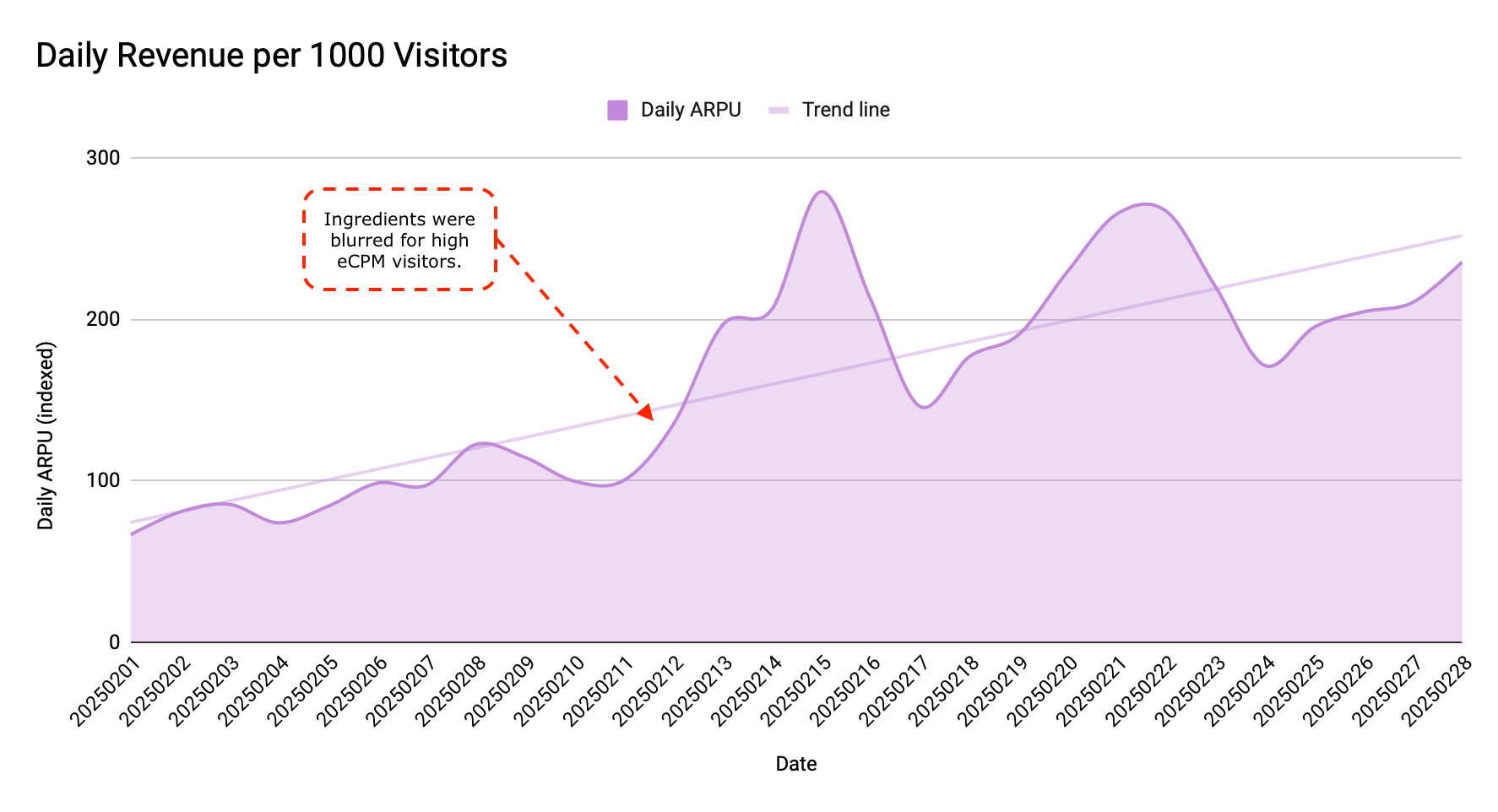 Within just 1–2 days, the impact was obvious. Both revenue per session (ARPU) and eCPM skyrocketed.